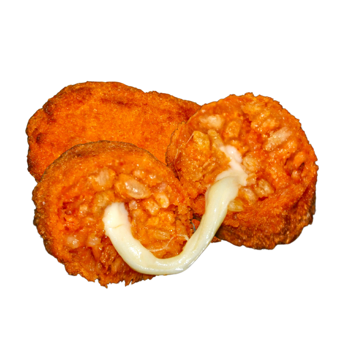 A traditional finger food originating from Italy that is based on rice with a tomato and mozzarella filling and covered in a thin, crisp breadcrumb.