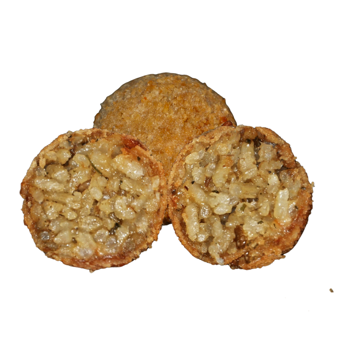 A traditional finger food originating from Italy that is based on rice with porcini mushrooms and mozzarella and covered in a thin, crisp breadcrumb.
